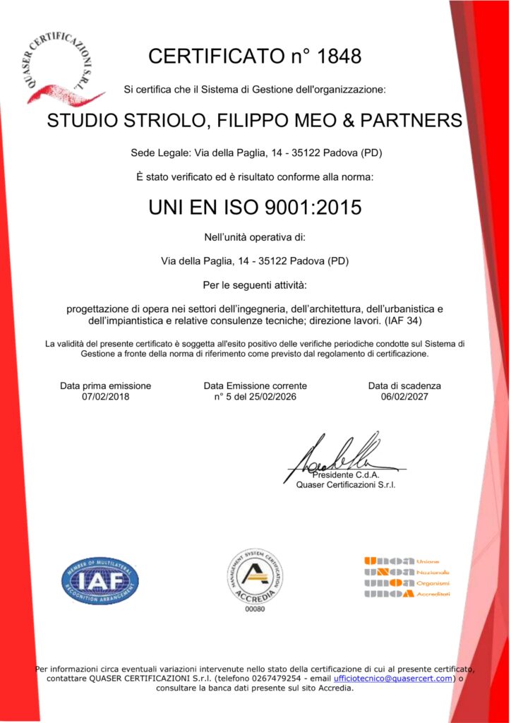 Lo Studio Striolo, Filippo Meo & Partners è in grado di fornire servizi certificati attinenti la progettazione nei settori dell’Ingegneria, dell’Architettura, dell’Urbanistica e della Direzione Lavori, raggiungendo sempre la piena conformità ai requisiti qualitativi richiesti nel complessivo sistema di gestione.